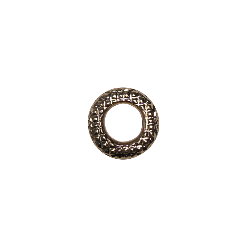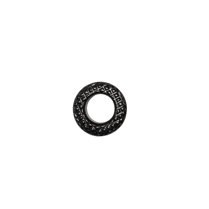 الحلقات والثقوب: هي حلقات معدنية يتم إدخالها في القماش أو الجلد لتعزيز فتحات الأربطة أو الحبال أو أدوات التثبيت الأخرى. ويمكن أيضا أن تستخدم كعناصر زخرفية.